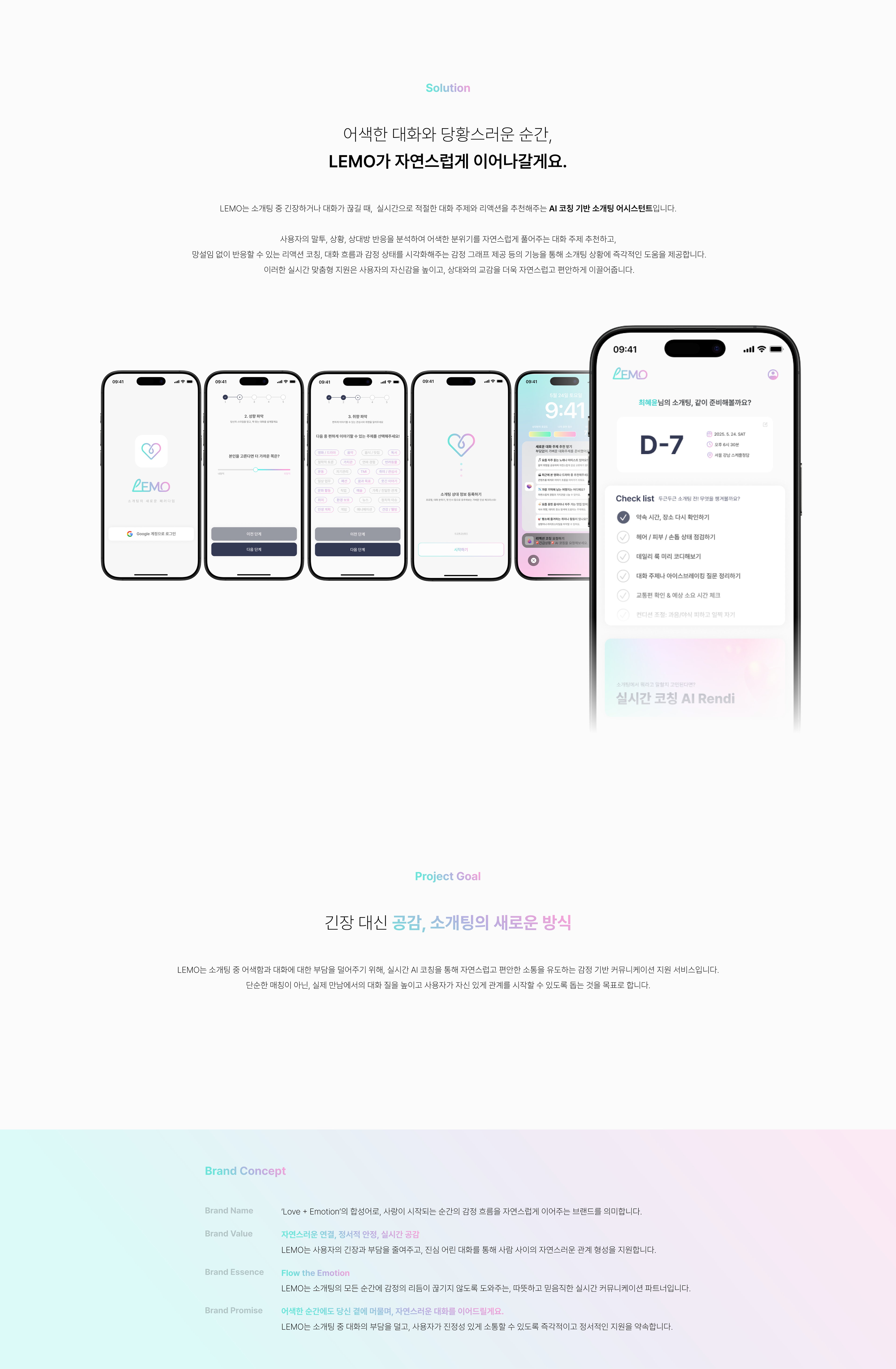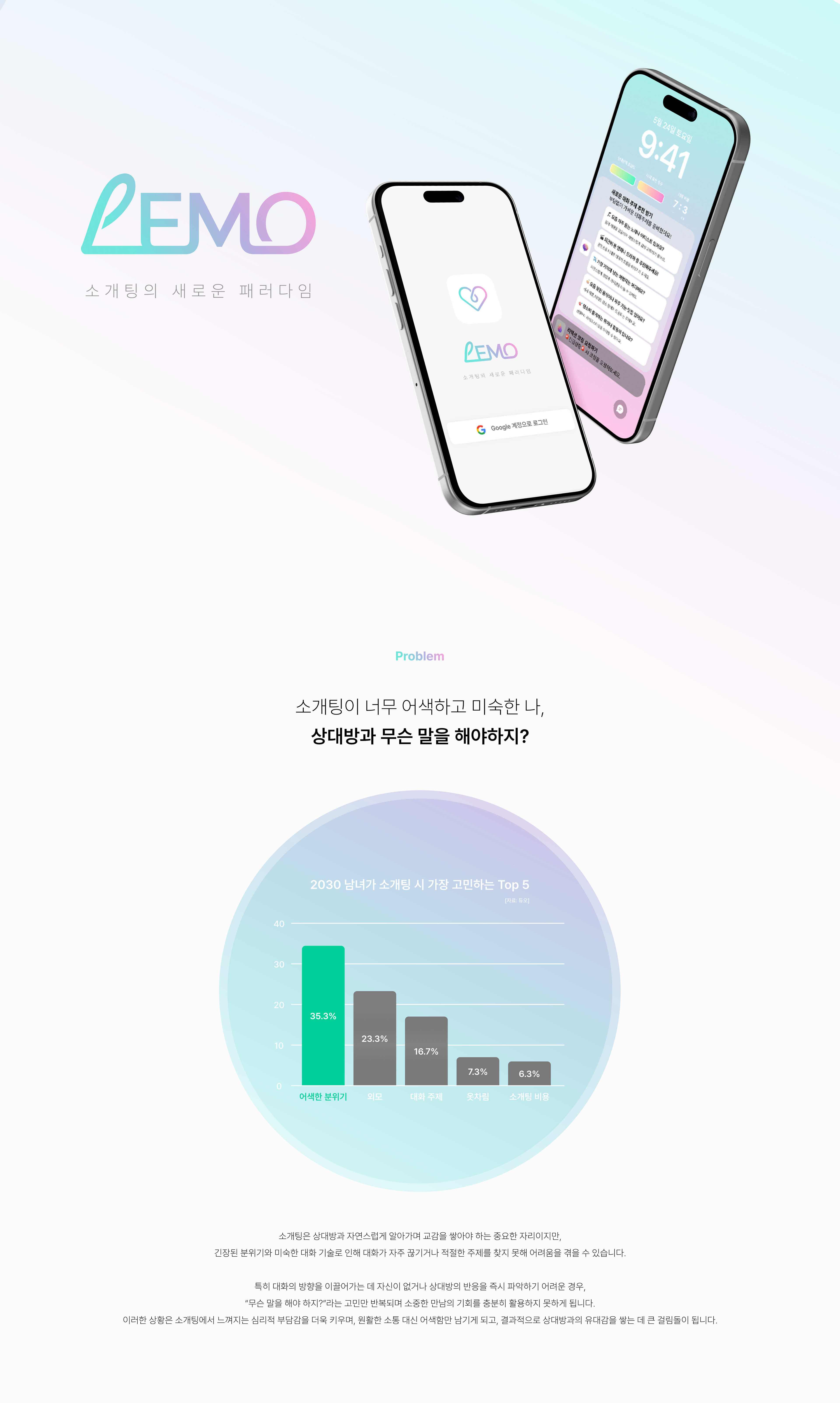 LEMO는 소개팅 상황에서 자연스러운 대화를 유도하는 실시간 AI 코칭 서비스입니다. 소개팅 중 긴장되거나 대화가 끊길 때 사용자의 성향과 대화 흐름을 분석하여 상황에 맞는 대화 주제를 추천하고, 적절한 리액션 방식과 피해야 할 표현까지 안내함으로써 소통을 원활하게 만듭니다. 또한, 대화 주도권과 감정 흐름을 시각화한 그래프를 통해 사용자가 현재 분위기를 직관적으로 파악하고 대처할 수 있도록 돕습니다. 단순한 소개팅 앱을 넘어, 감정의 흐름과 관계 형성을 실시간으로 지원하는 코칭 기반 인터페이스를 통해 소개팅 경험의 질을 한층 끌어올리는 것이 LEMO의 핵심 가치이자 목적입니다.