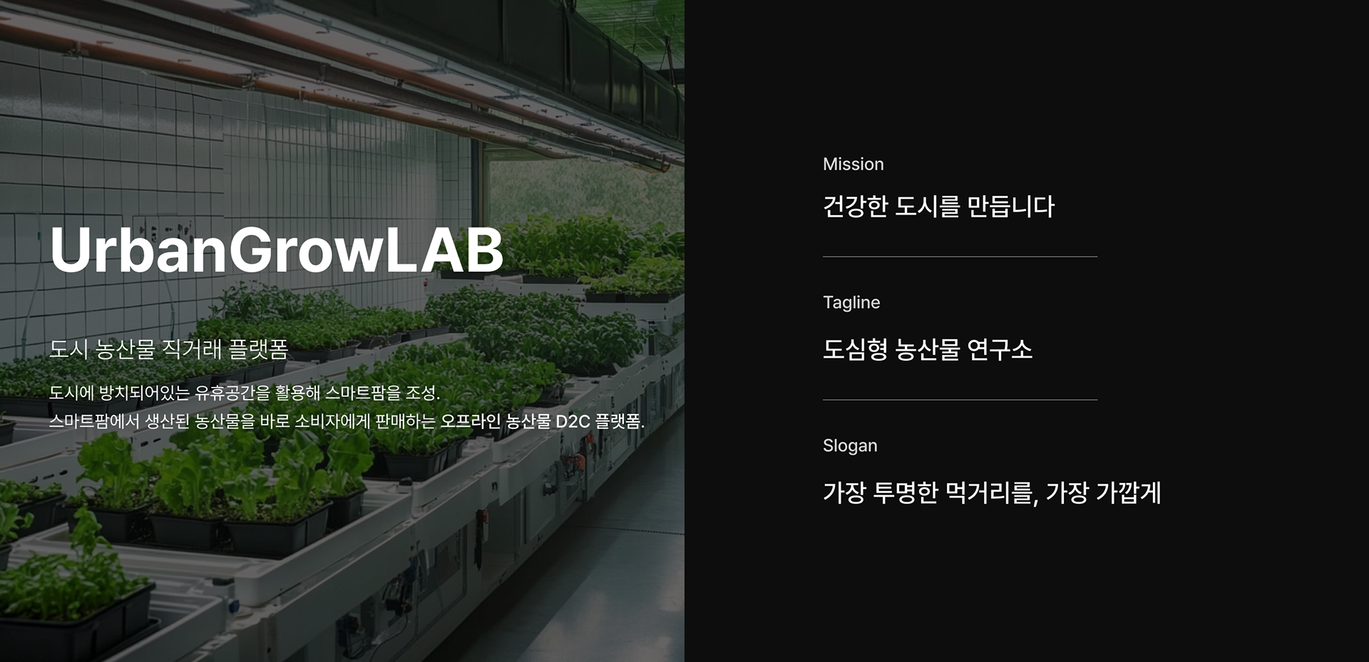 방치된 도심 속 유휴 공간, 건강히 되살릴 방법은 없을까요? UrbanGrow.LAB은 도심 유휴공간을 활용한 스마트팜 농산물 직판매 플랫폼입니다. 일상과 가장 가까이에서 가장 깨끗하고 투명한 먹거리를 만나보세요. 도심형 농산물 연구소, UrbanGrow.LAB