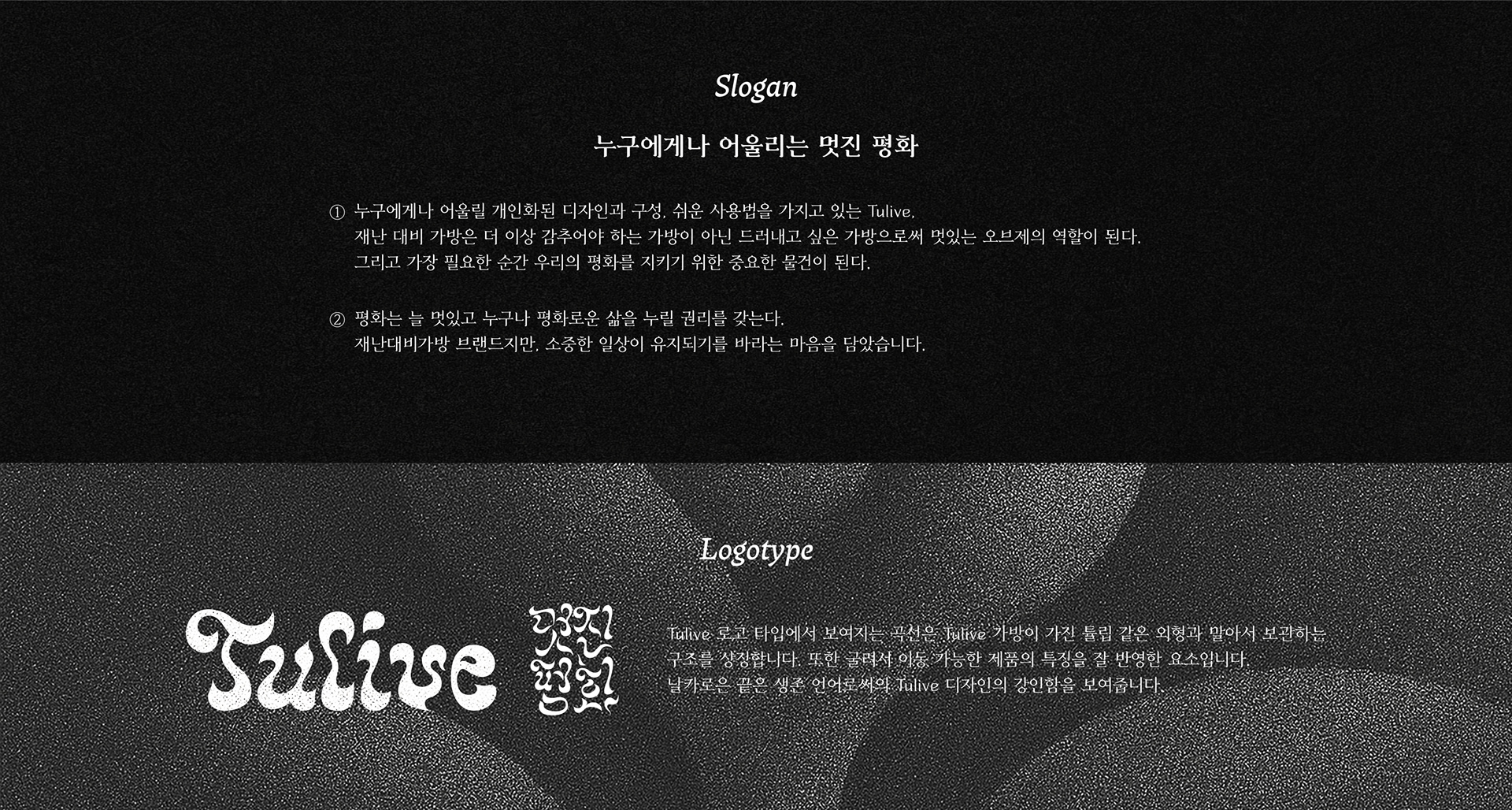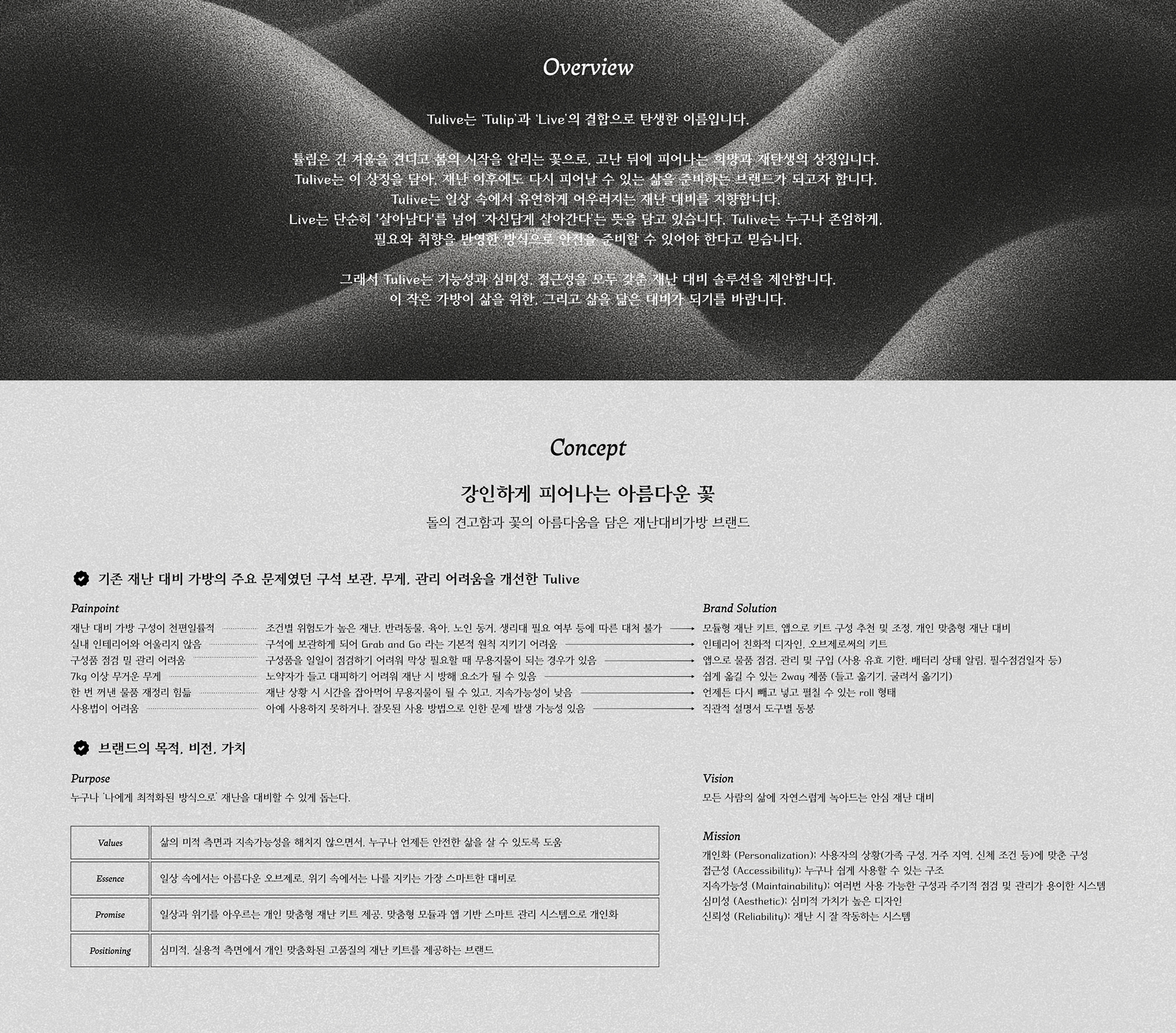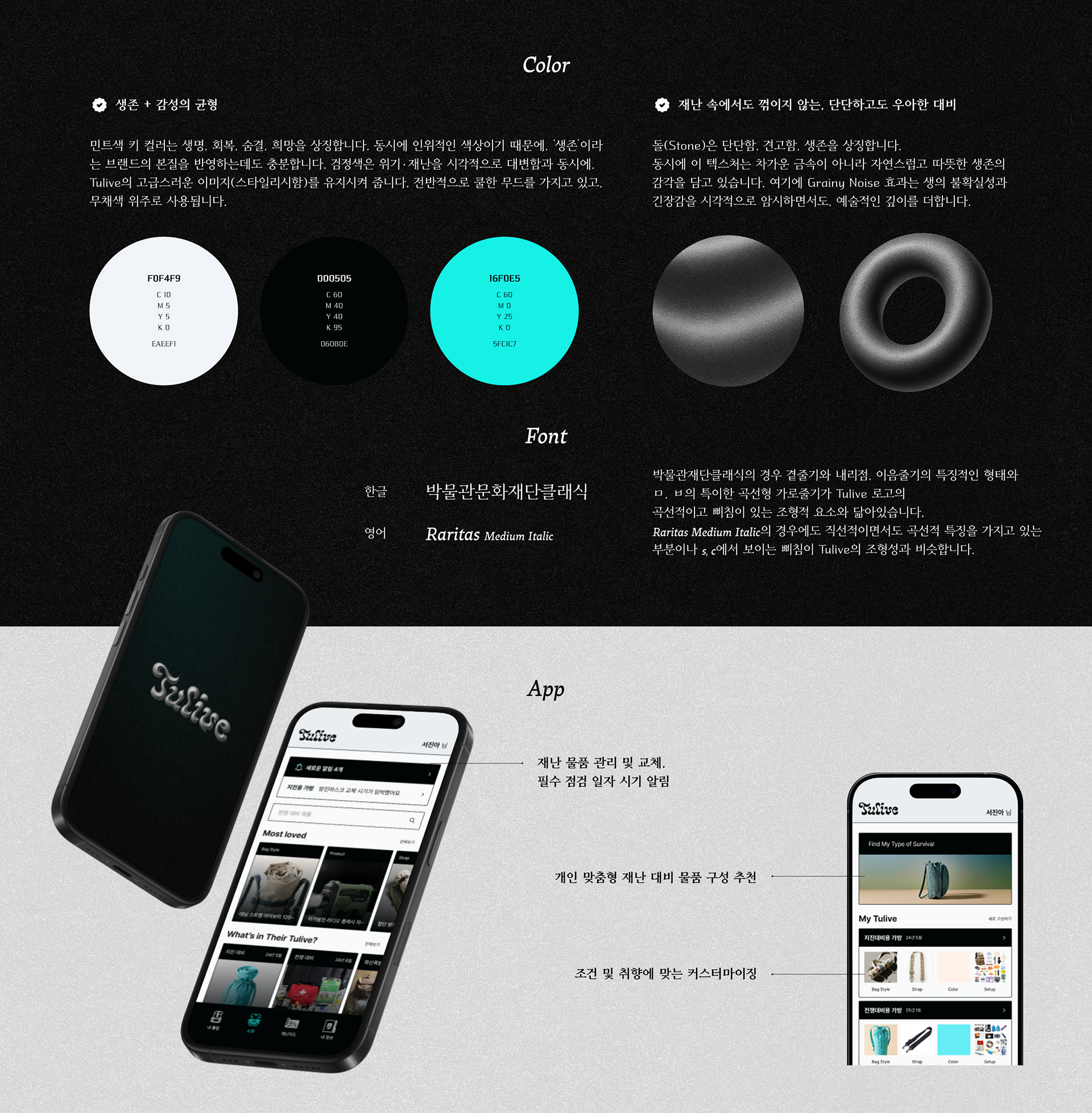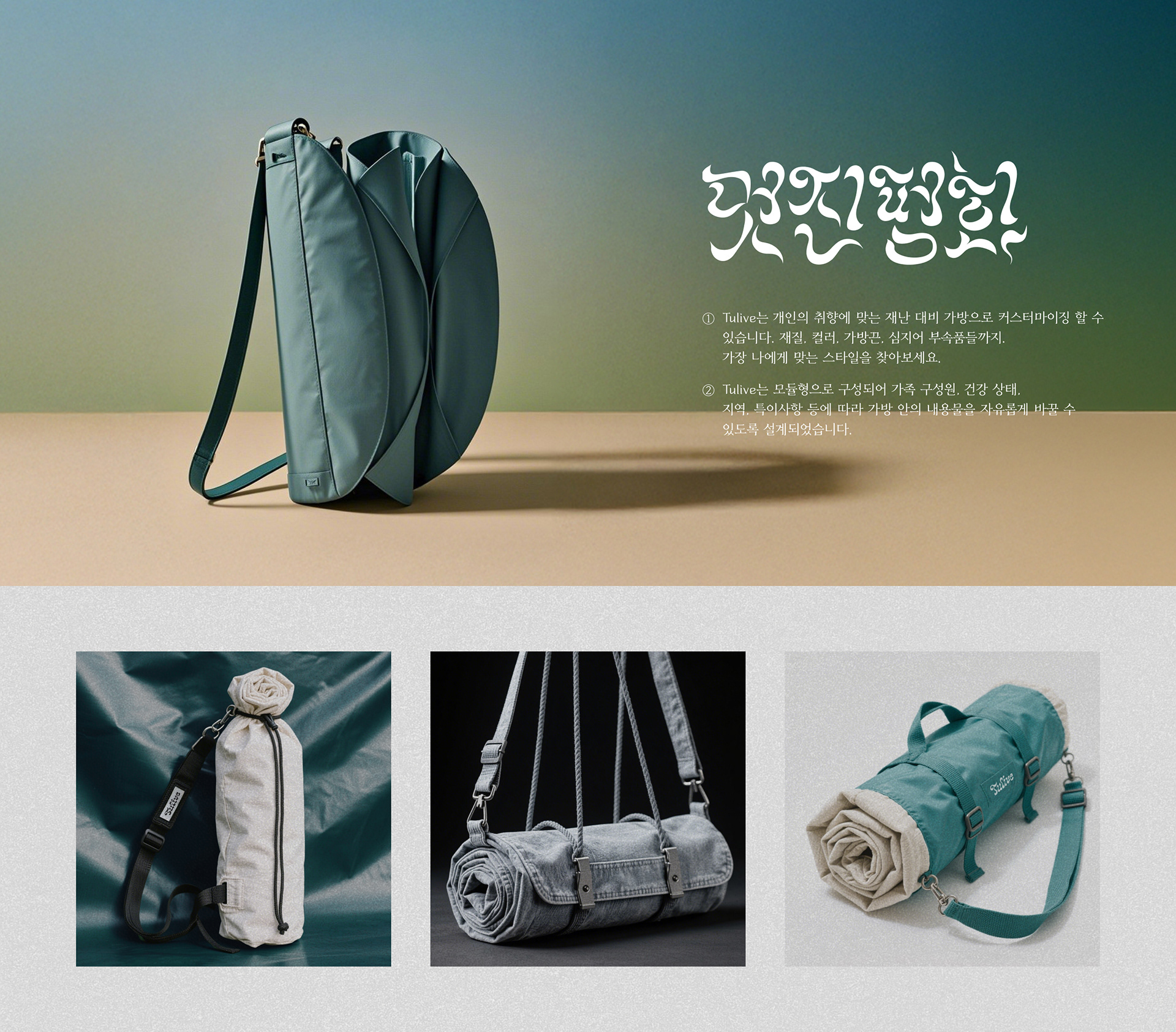 Tulive는 재난 대비 가방을 ‘숨겨두는 물건’이 아닌 ‘꺼내두고 싶은 오브제’로 정의합니다.