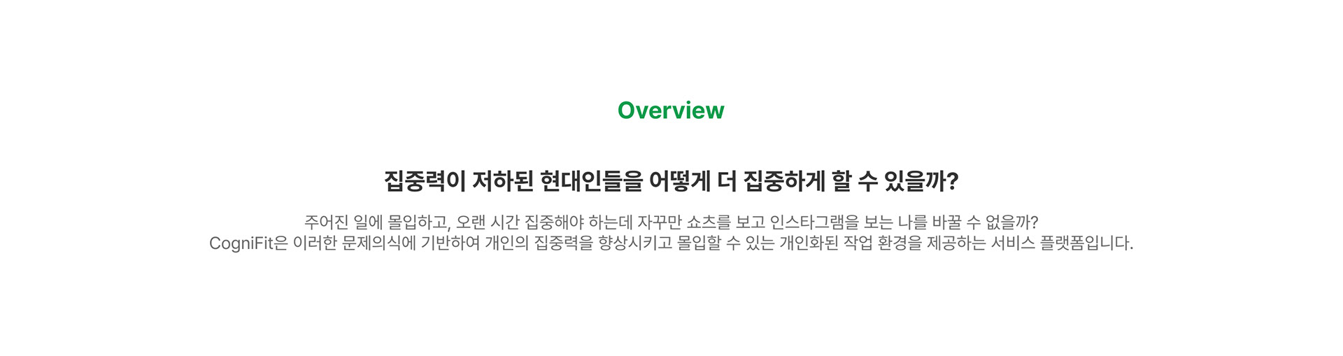 CogniFit은 개인의 집중력을 향상시키기 위해 데이터 기반으로 몰입 환경을 설계하는 브랜드입니다. 단순한 생산성 도구가 아니라, 사람마다 다른 작업 리듬과 환경 반응을 인지하고, 그에 맞춰 가장 효과적인 몰입 루틴을 맞춤화하는 것을 목표로 합니다.