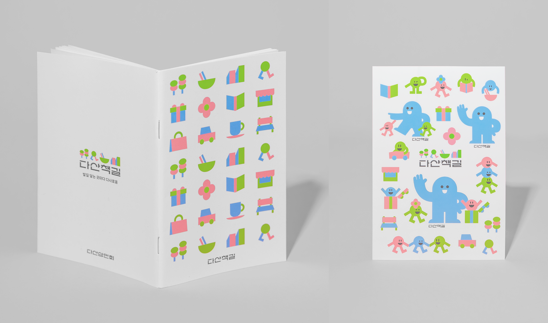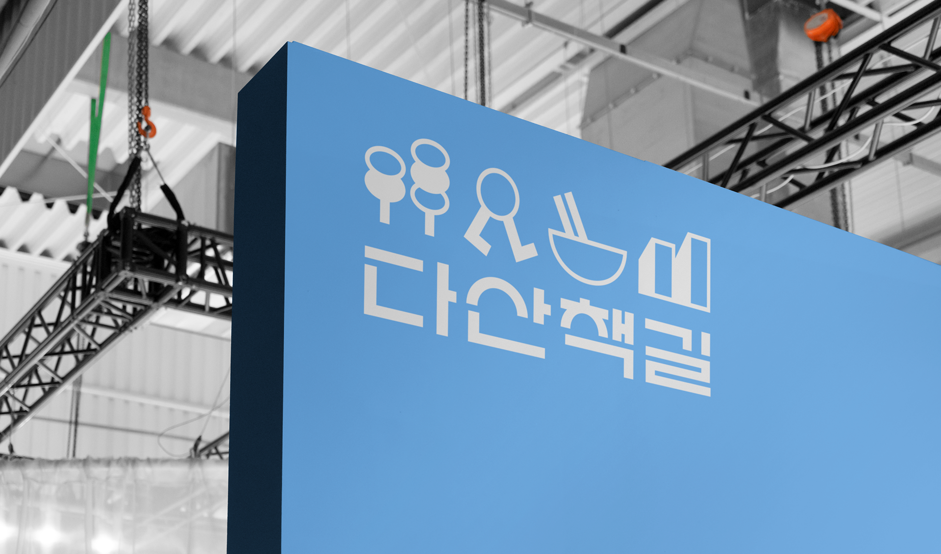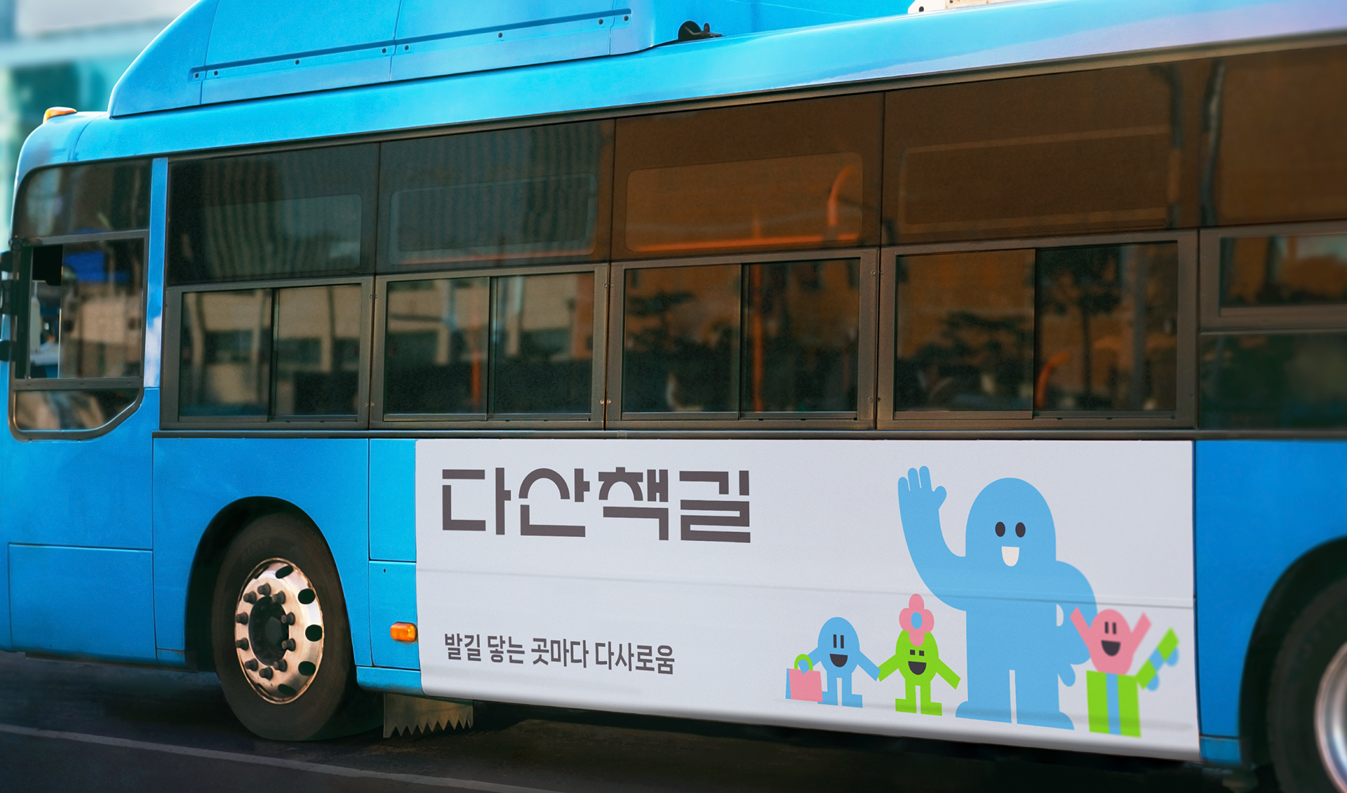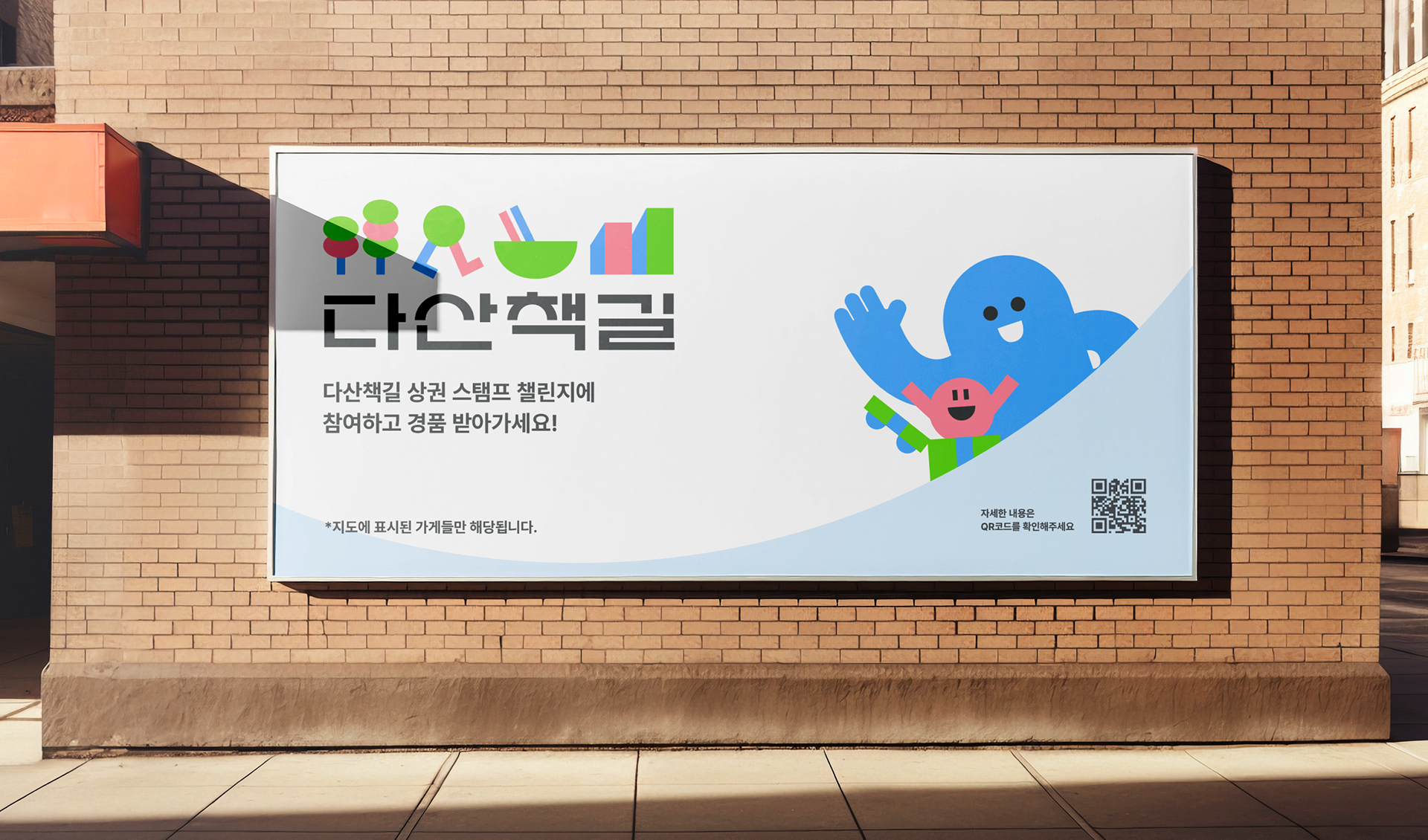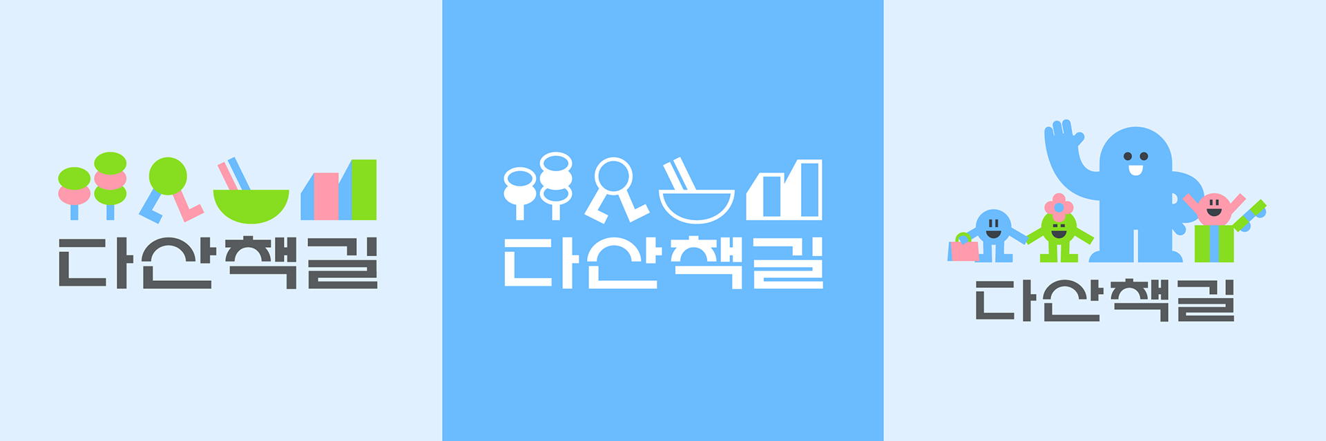 Da San Chaek Gil is a brand representing the commercial and cultural district of Dasan New Town in Namyangju. Supported by the city government and the Regional Intellectual Property Center under the Korean Intellectual Property Office, FRONT KIT conducted its total branding including the naming which indicates “Da San (area) + San Chaek (stroll) + Chaek (book) + Gil (path),” that are the features of the district. Also, the project encompassed the creation of a comprehensive brand identity, including slogans, storytelling, characters, and application designs that reflect Dasan’s vibrant scenery and cultural sentiment. Additionally, intellectual property rights were filed, workshops for merchants were conducted, and the geographic name was officially registered, ensuring a systematic and professional public branding.
