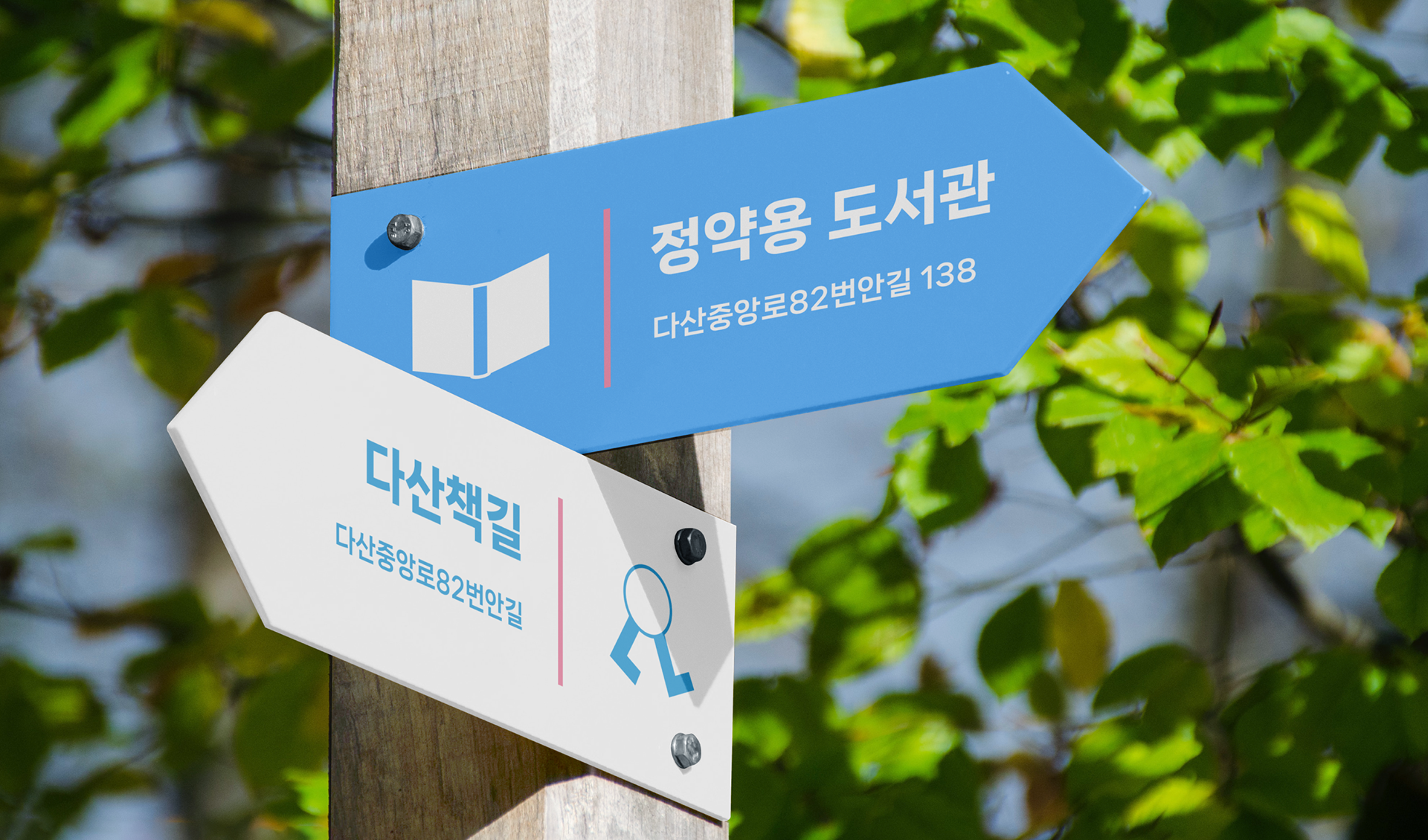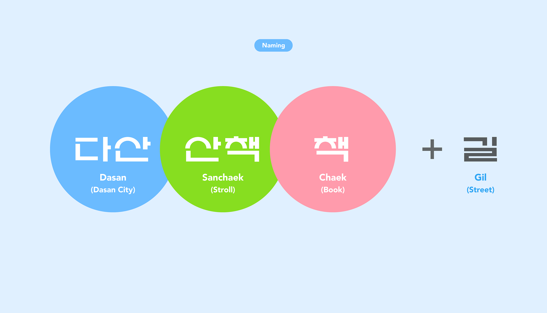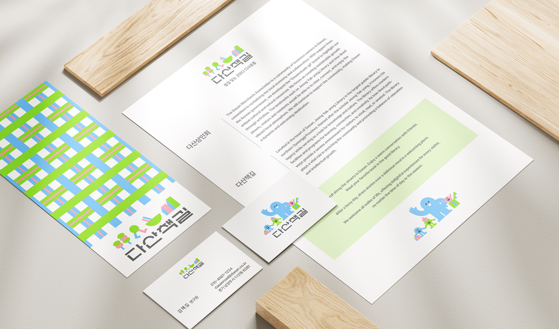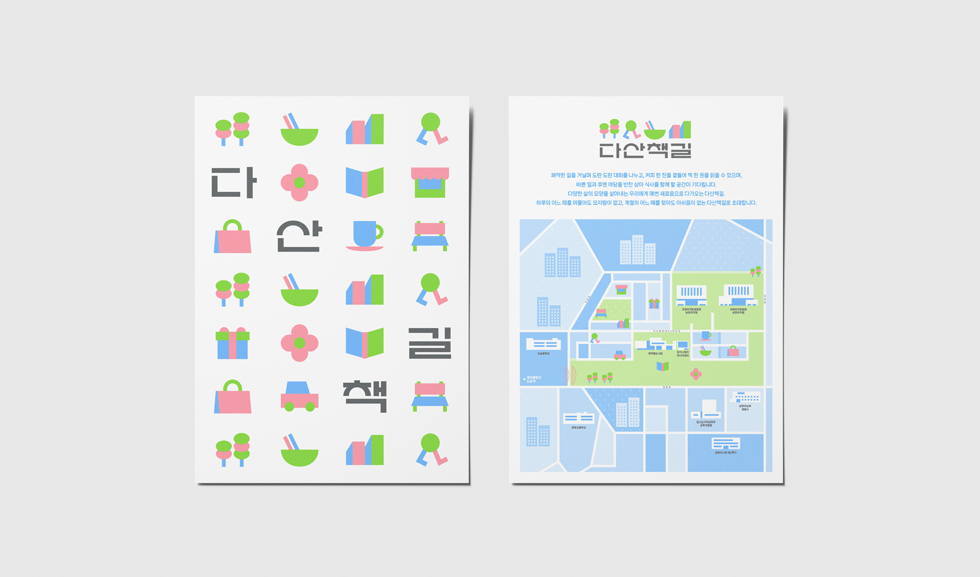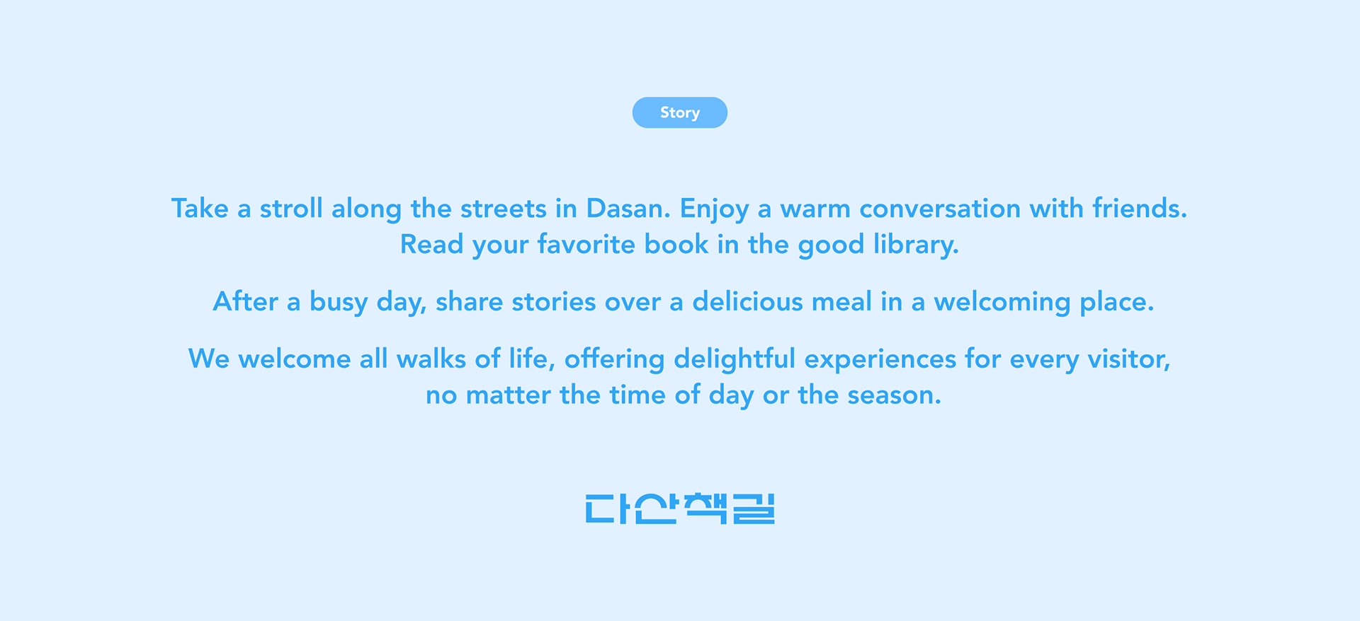 Da San Chaek Gil is a brand representing the commercial and cultural district of Dasan New Town in Namyangju. Supported by the city government and the Regional Intellectual Property Center under the Korean Intellectual Property Office, FRONT KIT conducted its total branding including the naming which indicates “Da San (area) + San Chaek (stroll) + Chaek (book) + Gil (path),” that are the features of the district. Also, the project encompassed the creation of a comprehensive brand identity, including slogans, storytelling, characters, and application designs that reflect Dasan’s vibrant scenery and cultural sentiment. Additionally, intellectual property rights were filed, workshops for merchants were conducted, and the geographic name was officially registered, ensuring a systematic and professional public branding.