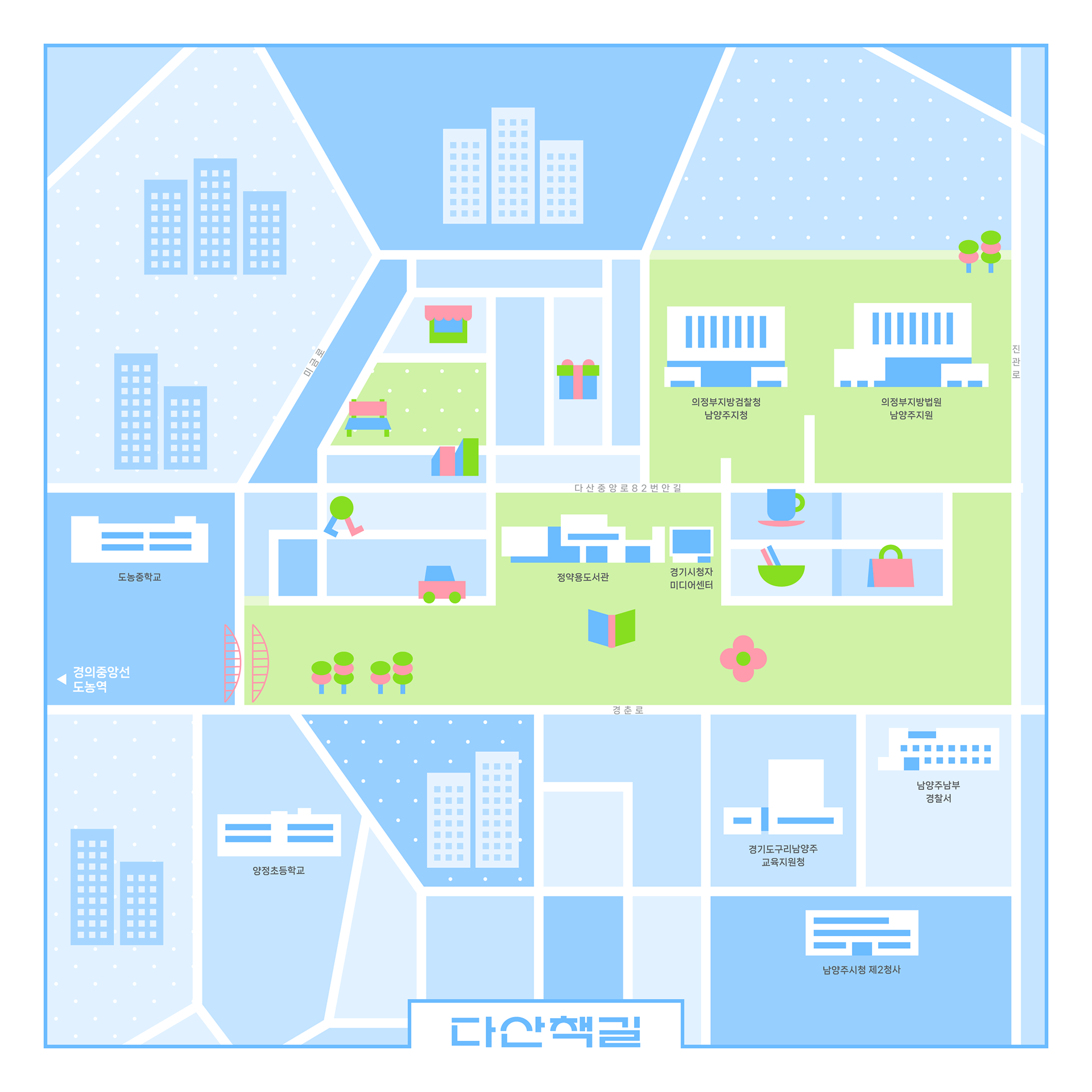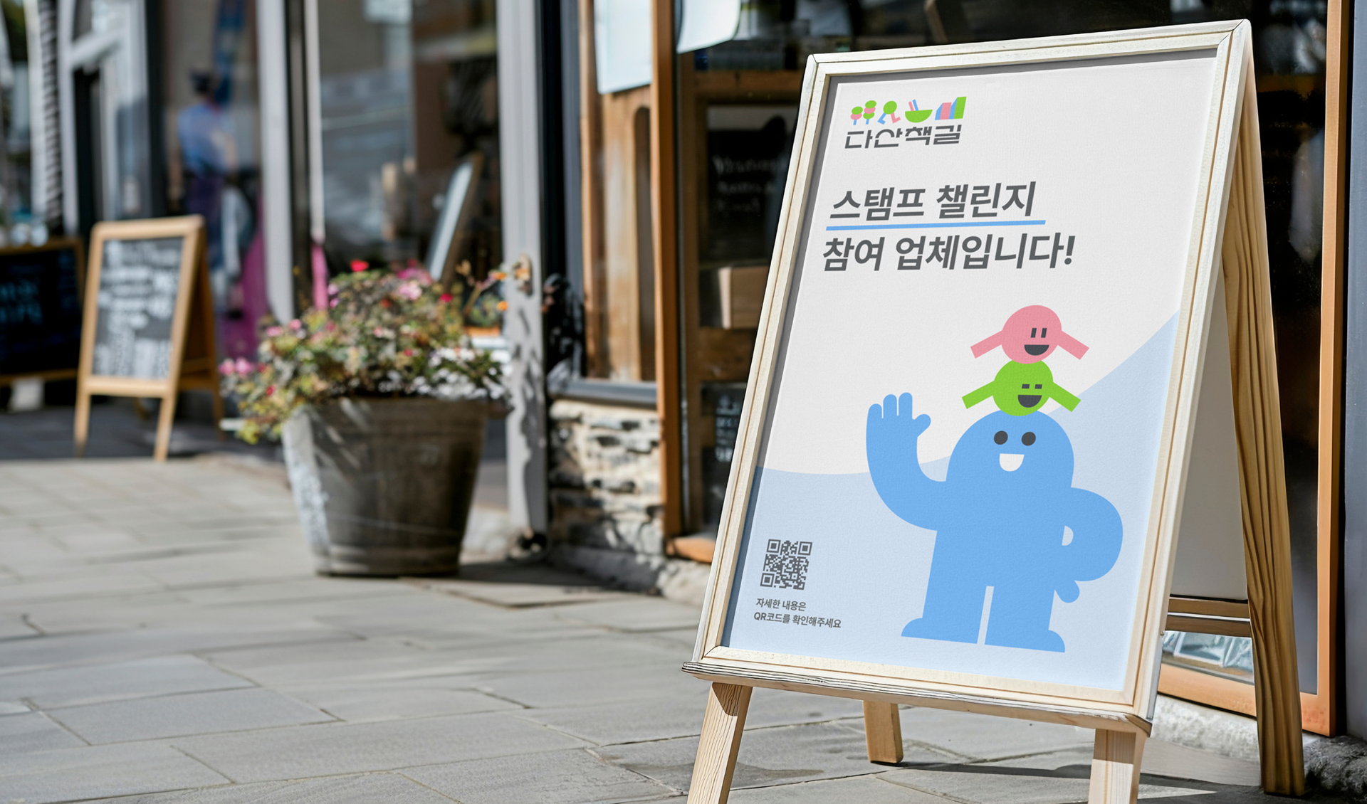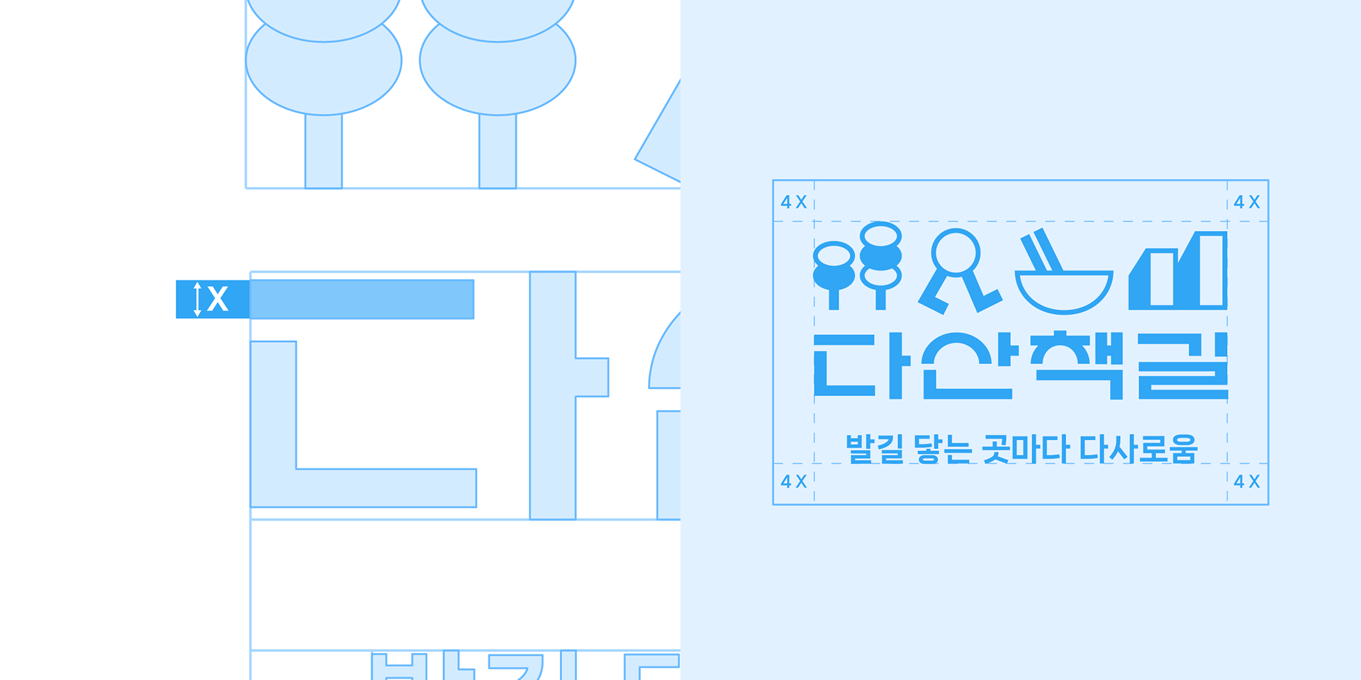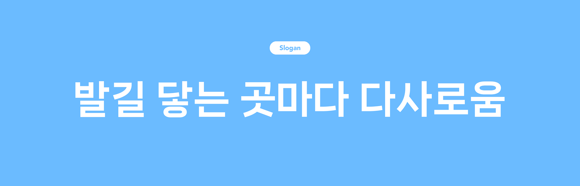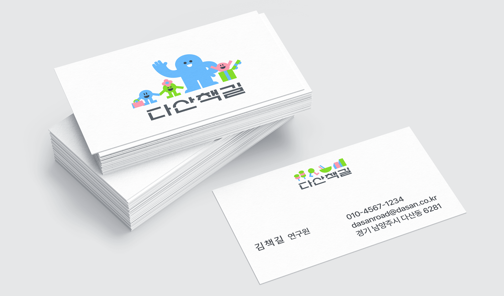 Da San Chaek Gil is a brand representing the commercial and cultural district of Dasan New Town in Namyangju. Supported by the city government and the Regional Intellectual Property Center under the Korean Intellectual Property Office, FRONT KIT conducted its total branding including the naming which indicates “Da San (area) + San Chaek (stroll) + Chaek (book) + Gil (path),” that are the features of the district. Also, the project encompassed the creation of a comprehensive brand identity, including slogans, storytelling, characters, and application designs that reflect Dasan’s vibrant scenery and cultural sentiment. Additionally, intellectual property rights were filed, workshops for merchants were conducted, and the geographic name was officially registered, ensuring a systematic and professional public branding.