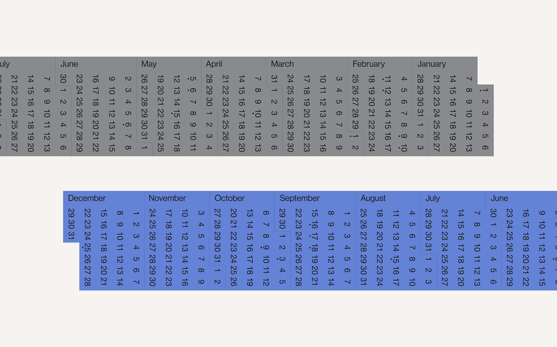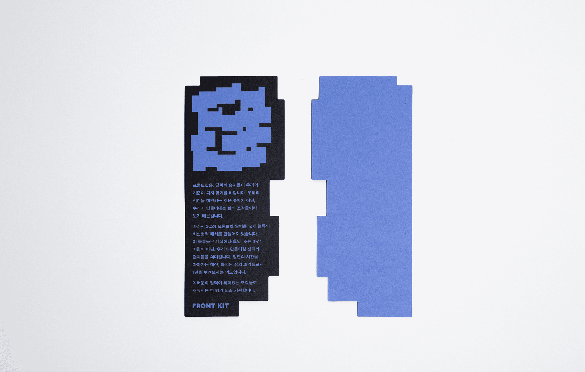 What represents our time is not numbers, but the pieces of life we create. Therefore, the 2024 FRONT KIT Calendar is made of a non-linear arrangement of 12 blocks. These blocks are not about seasons, holidays, or deadlines, but rather the outcomes we will create. Instead of following a series of time periods, let's enjoy the year as accumulated pieces of life. FRONT KIT hopes that your calendar will be filled with meaningful pieces.