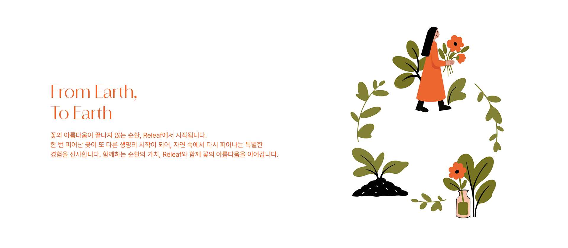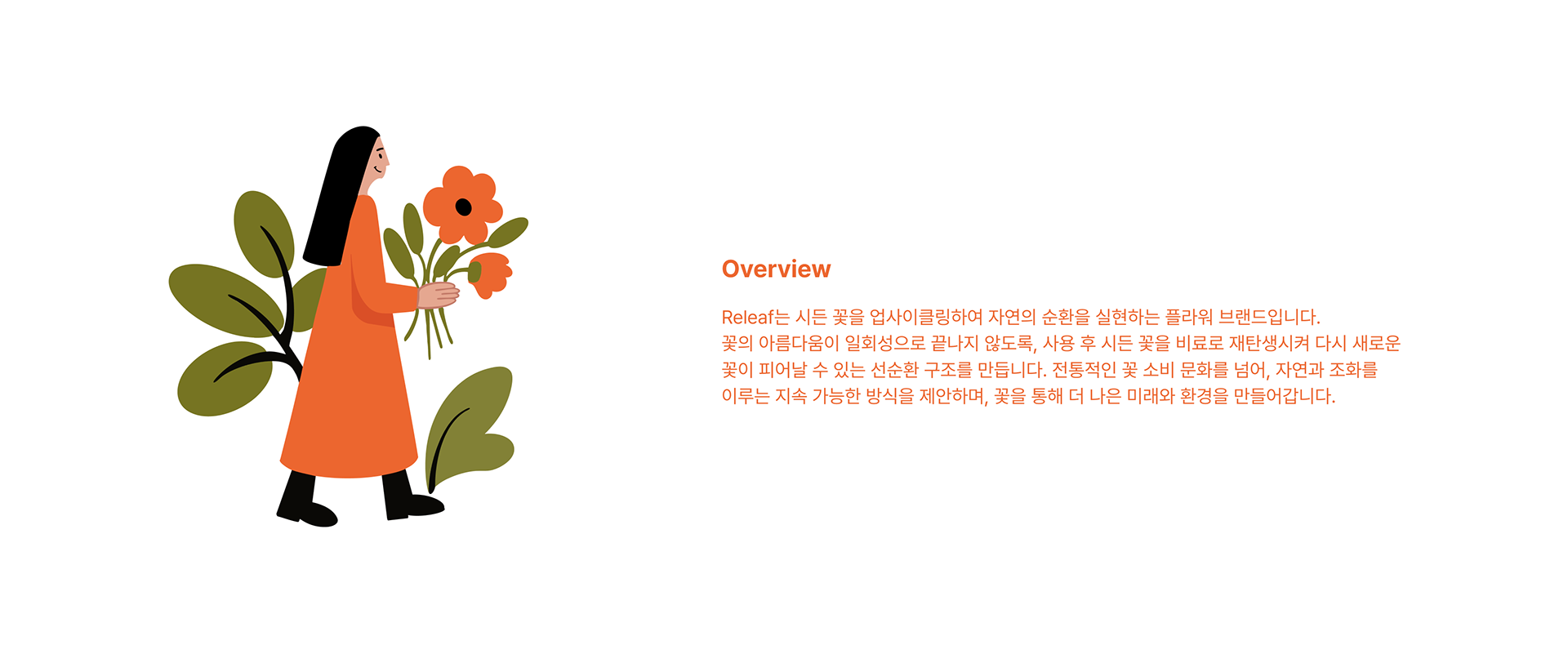 시든 꽃잎에서 다시 피어나는 꽃의 순환을 만드는 브랜드, Releaf입니다. 전통적인 꽃 소비 방식에서 벗어나, 꽃의 아름다움을 끝이 아닌 새로운 시작으로 바라봅니다. 꽃을 사고, 즐기고, 버리는 일회성 소비 대신, 꽃이 비료로 돌아가 또 다른 생명을 피워낼 수 있도록 순환 구조를 만듭니다. 단순한 플라워샵이 아닌, 자연과 함께하는 지속 가능한 경험을 제안합니다.