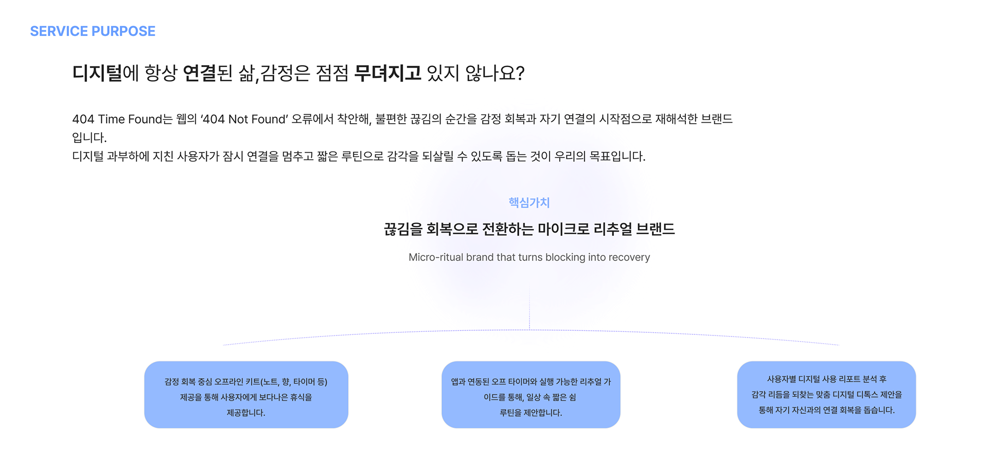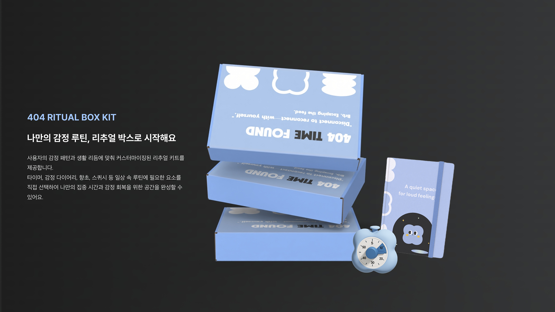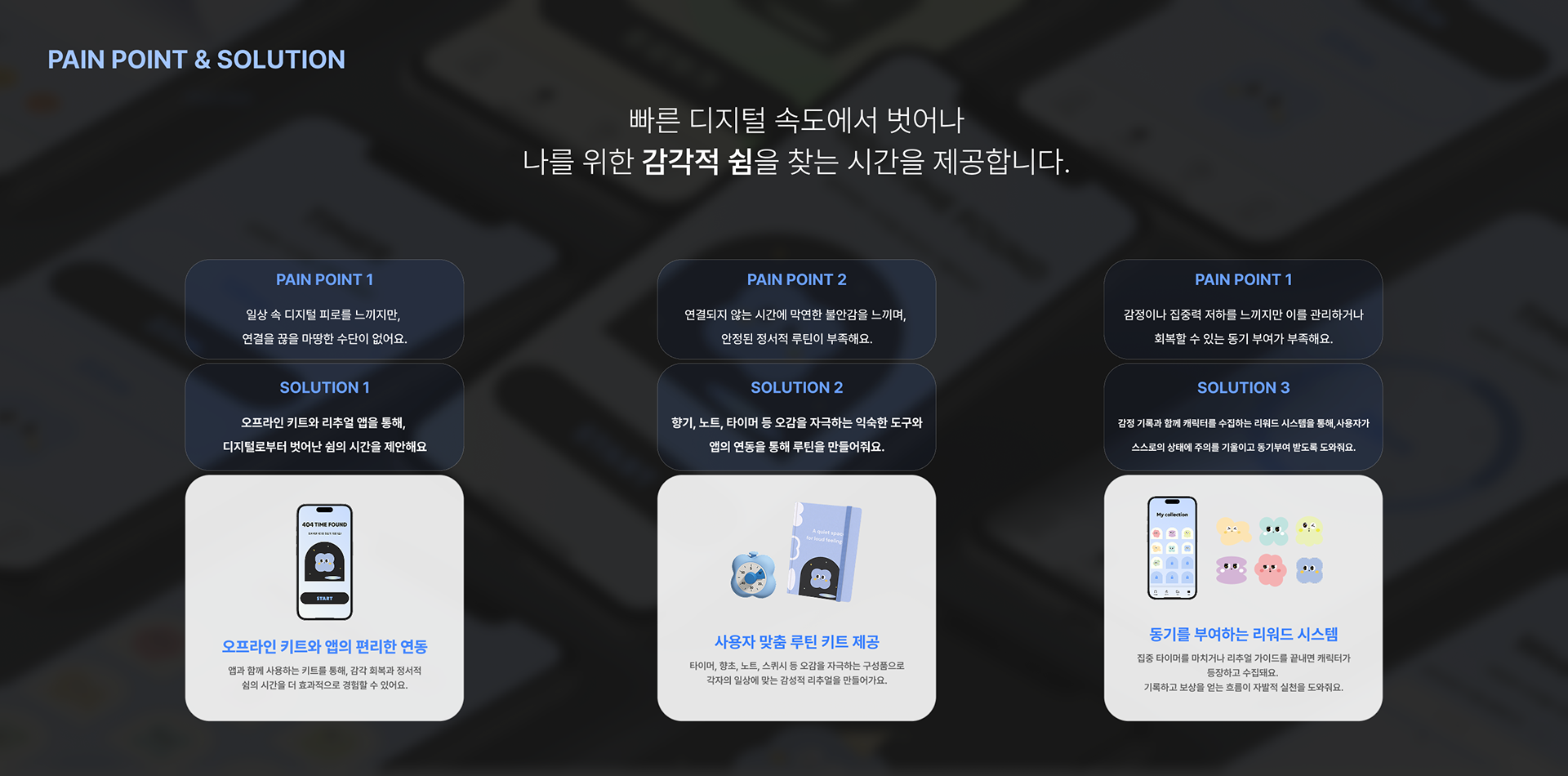 감정적 피로와 정보 과부하에 지친 사용자를 위한 감각 회복 키트와 짧은 리추얼 솔루션을 제공합니다.