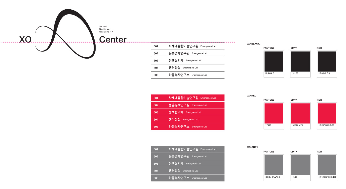 action seoul conducted the brand identity strategy and development of the "XO Center". To shape the "infinite emergence", the goal of the "XO Center", action seoul studied the shape of non-linear curves and designed symbols that show both X and O at the same time. The symbol conveys their vision that "Amid the process where different fields converge, the emergence of Solution O is emerged for Problem X." To achieve the value, in addition, various variations of symbols are made possible, because they do not define any limit on the emergence that can be achieved.