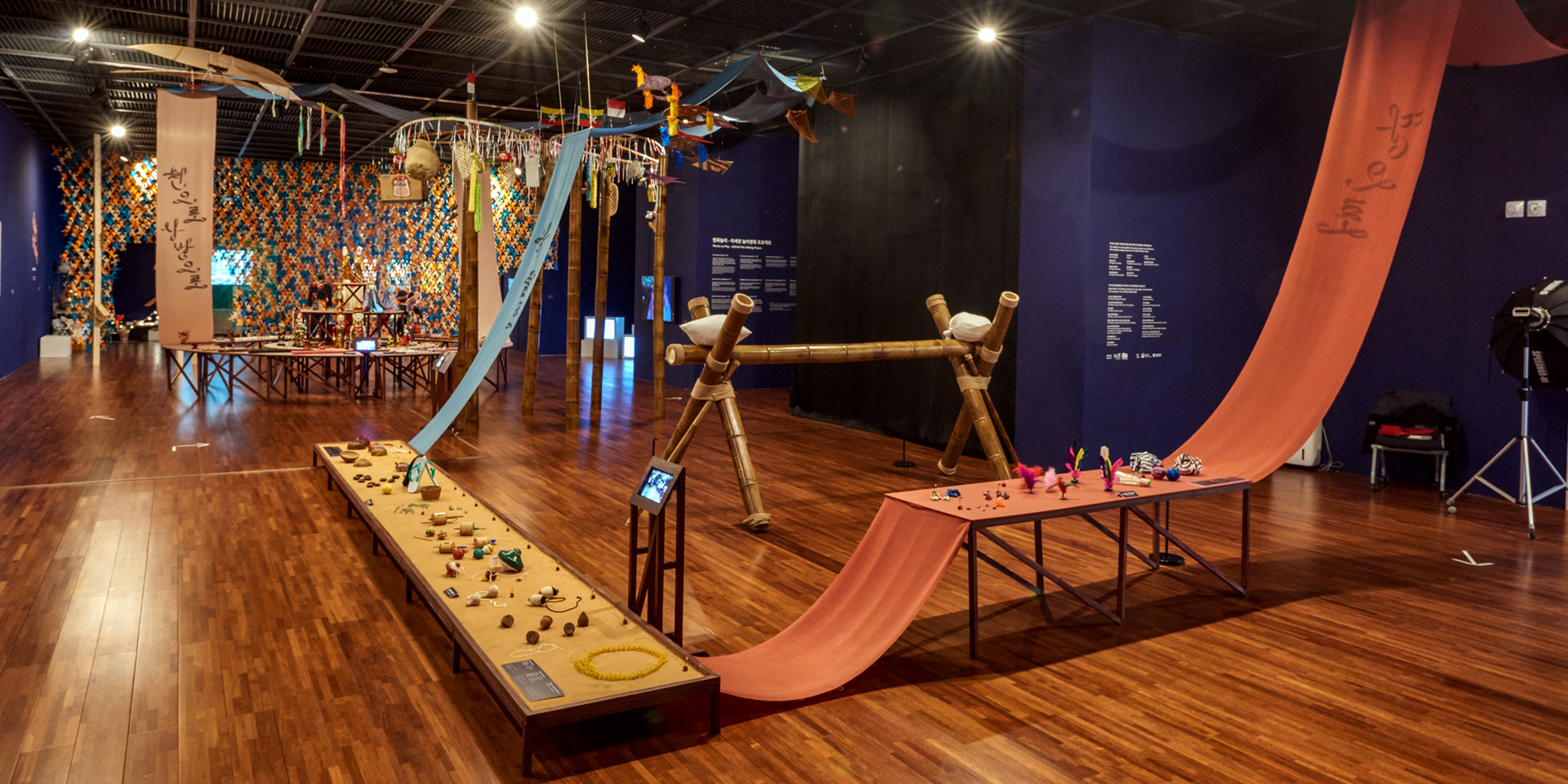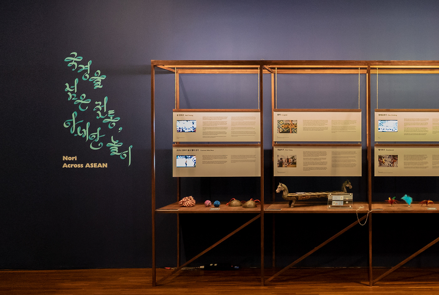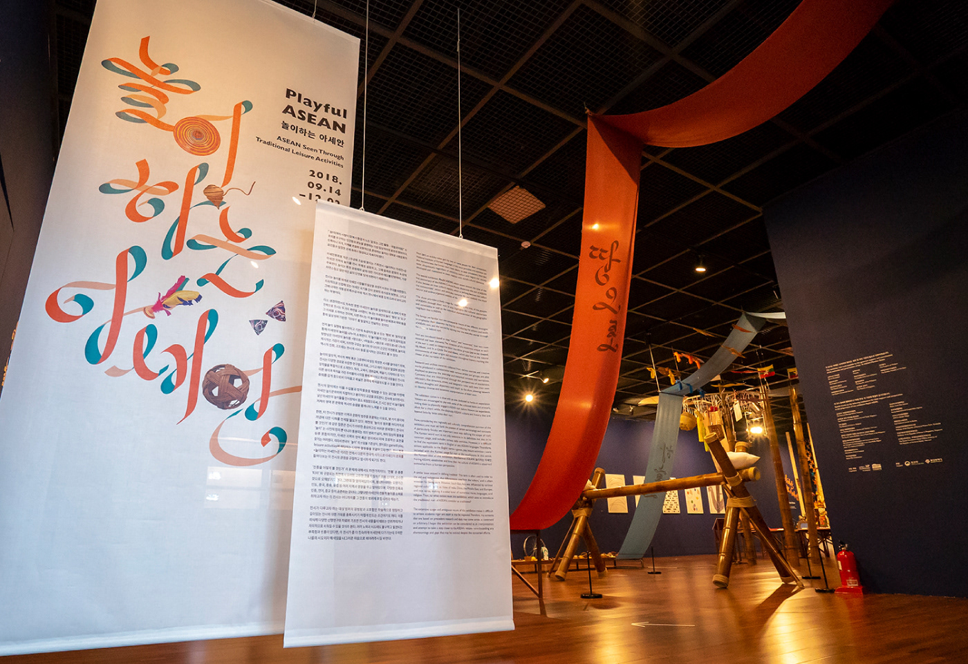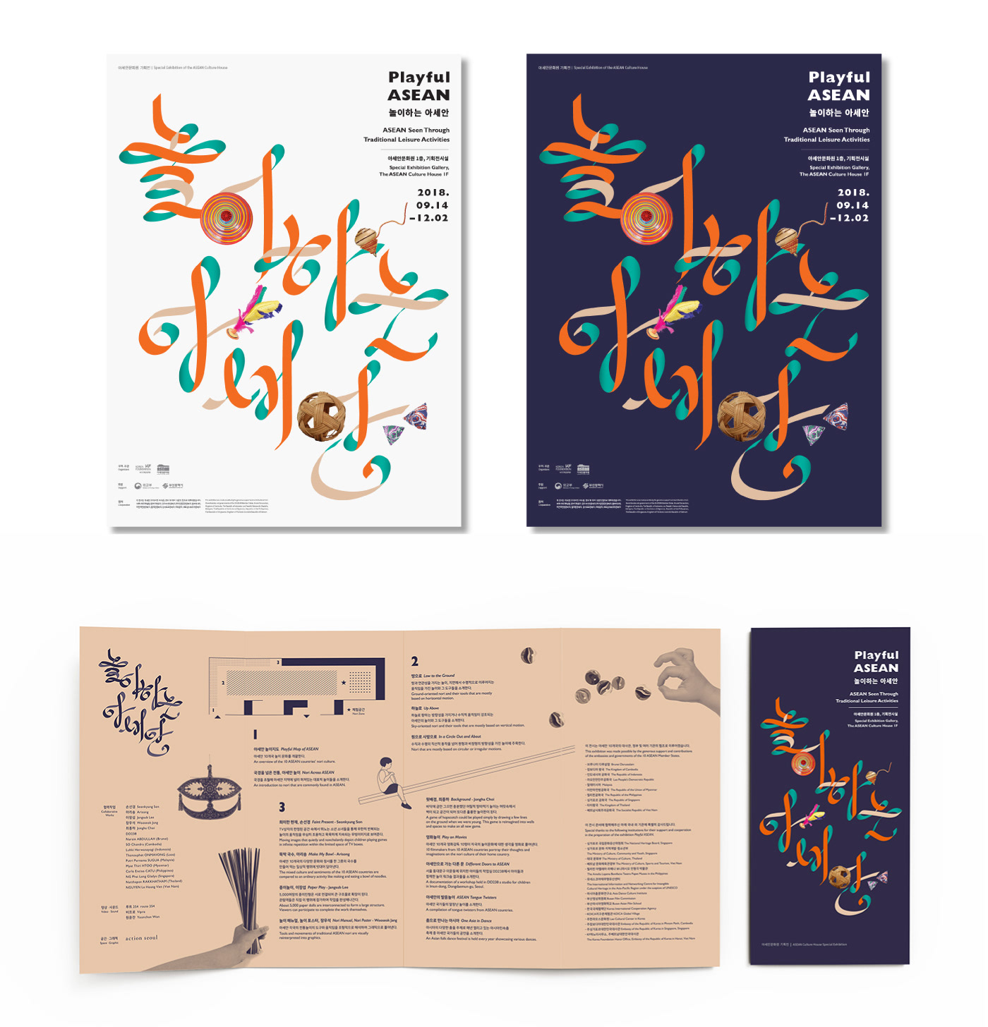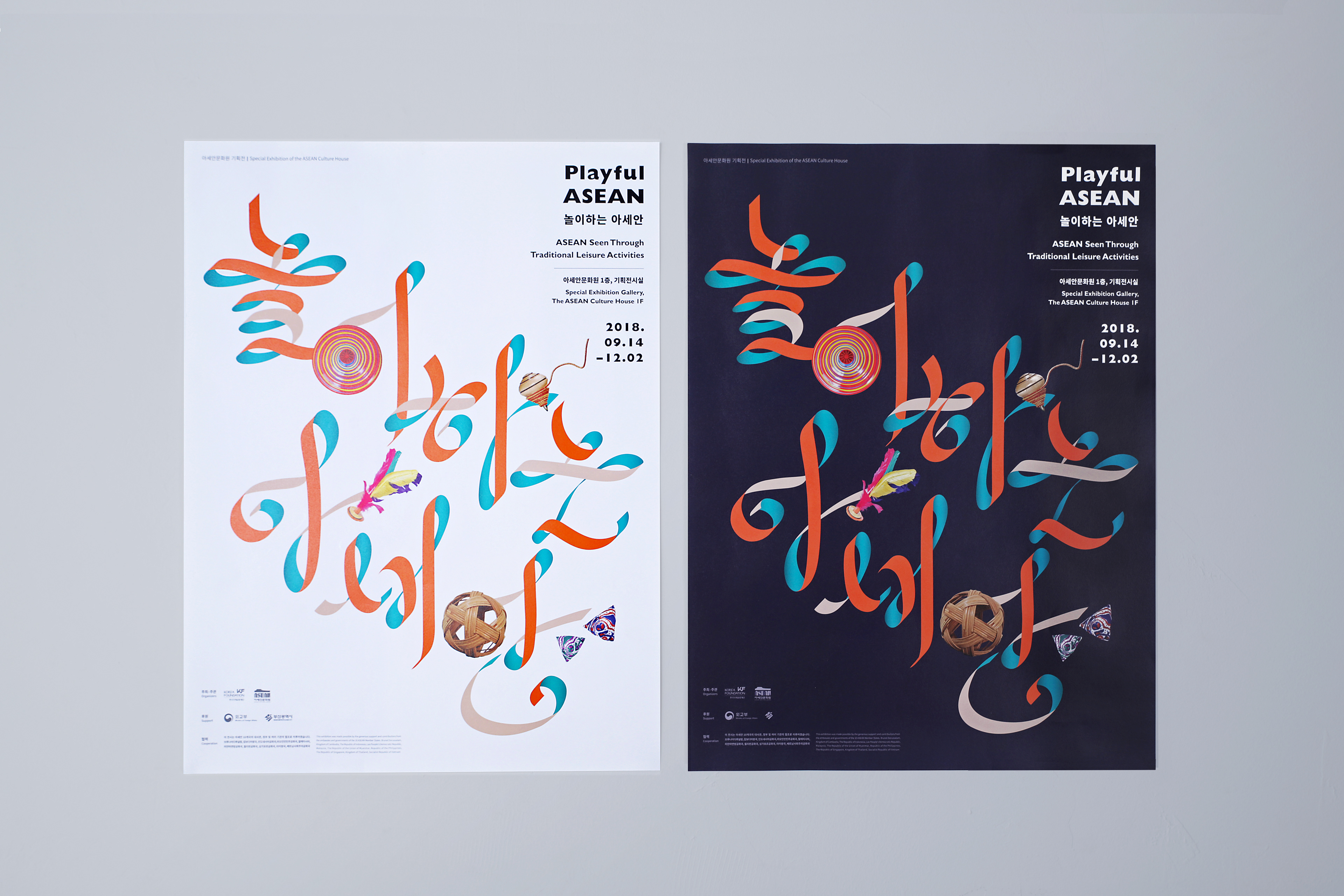 Visual identity design for a special exhibition <Playful ASEAN> in the Asean Culture House in Busan. action seoul has observed the traditional leisure activities of the 10 ASEAN countries by their direction and movement. The subtitle “Low to the Ground, Up Above, In a Circle Out and About” gave a specific concept to each section of exhibition. The long fabrics hanging on the ceiling cut across the exhibition hall shaping the direction and movement of ASEAN traditional games. Under the coherent identity of ‘Movement of Games,’ the ribbon lettering graphic design on a poster was also applied to the title design inside the exhibition hall.