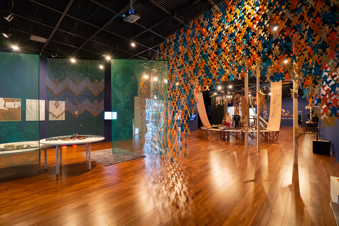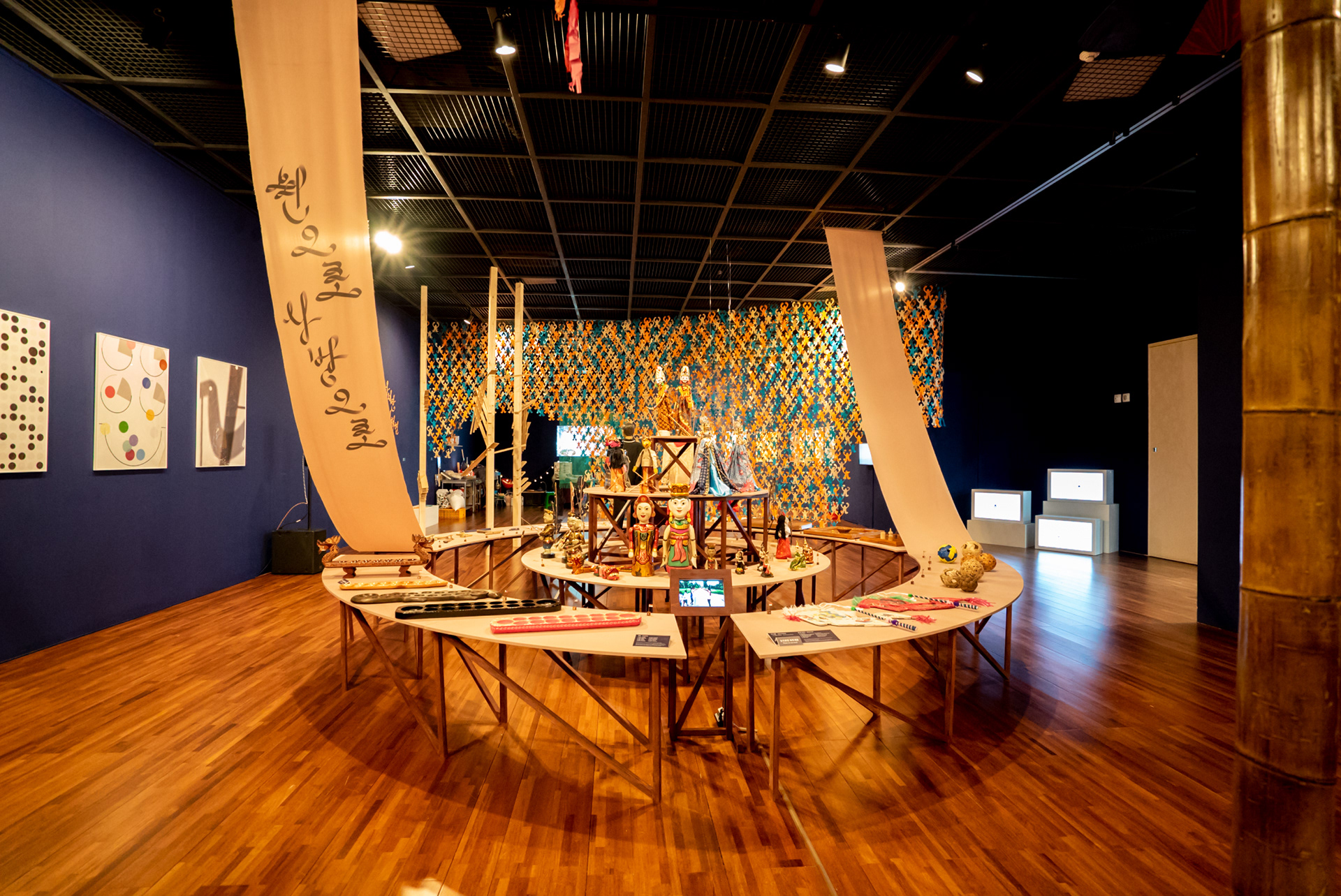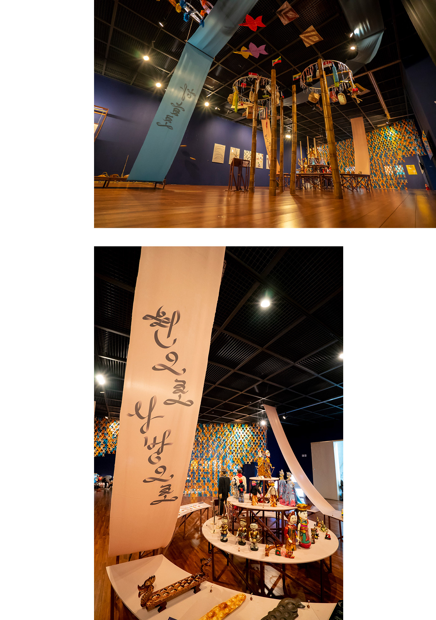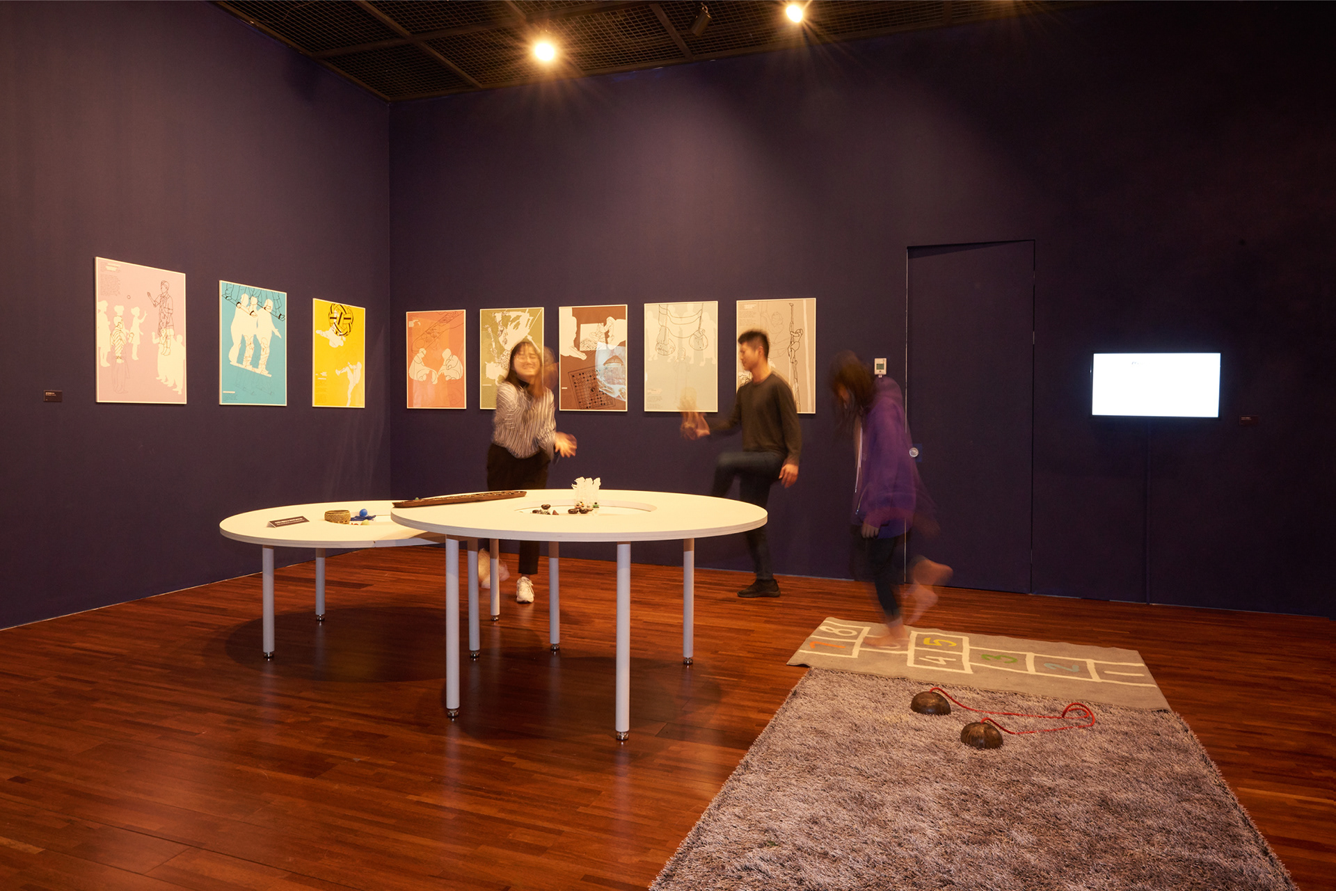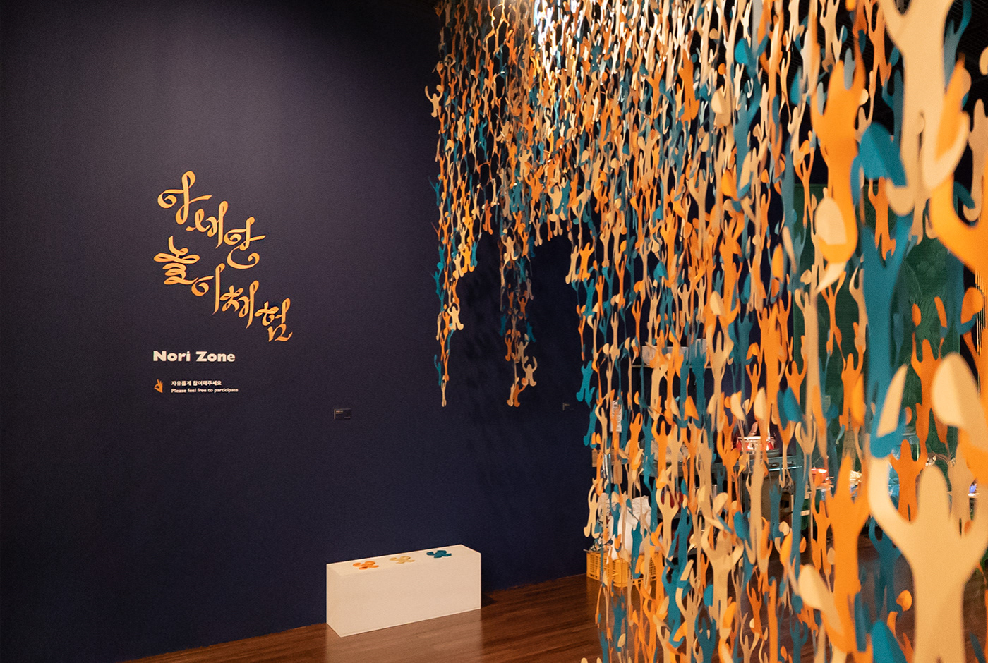 Visual identity design for a special exhibition <Playful ASEAN> in the Asean Culture House in Busan. action seoul has observed the traditional leisure activities of the 10 ASEAN countries by their direction and movement. The subtitle “Low to the Ground, Up Above, In a Circle Out and About” gave a specific concept to each section of exhibition. The long fabrics hanging on the ceiling cut across the exhibition hall shaping the direction and movement of ASEAN traditional games. Under the coherent identity of ‘Movement of Games,’ the ribbon lettering graphic design on a poster was also applied to the title design inside the exhibition hall.