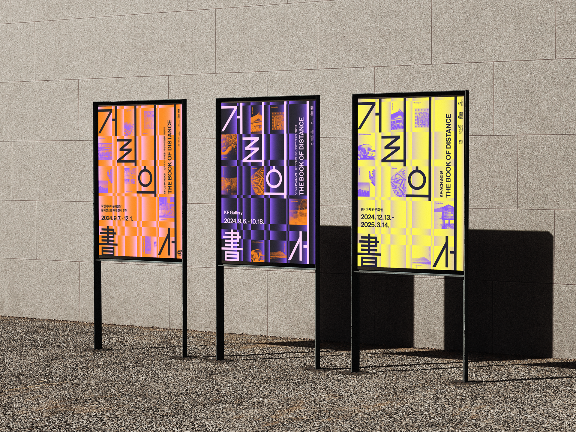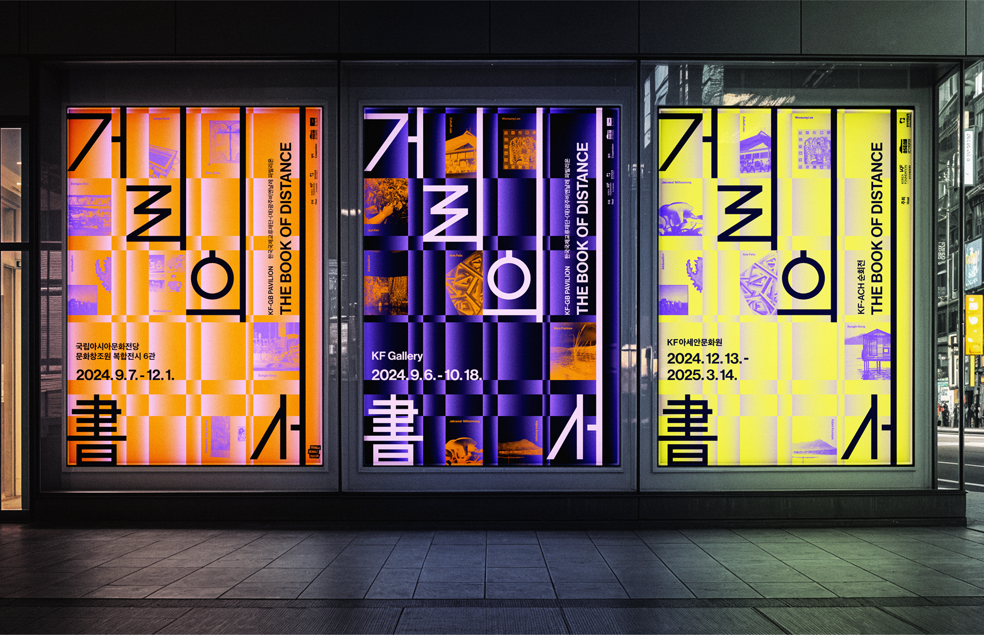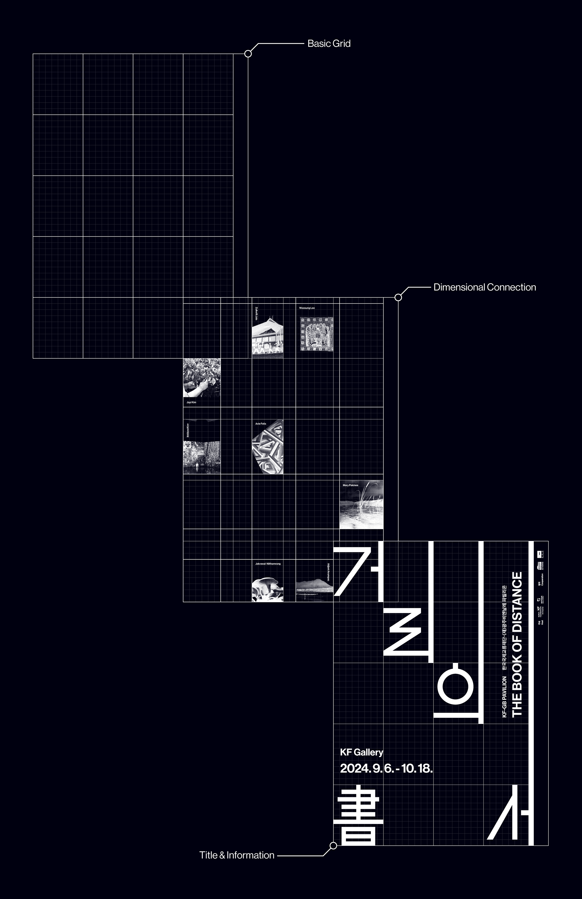 To embody the exhibition’s theme, Front Kit conceptualized a design that connects the experiences of artists existing in different times and spaces, allowing their artistic worlds to converge and expand in meaning. A neatly arranged grid was chosen as the key visual, serving as both a baseline for the exhibition title and a structural element that highlights each artwork.